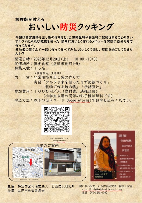 2025年12月20日(土)に益田市元町の寅虎食堂様で調理師が教えるおいしい防災クッキングを開催します。