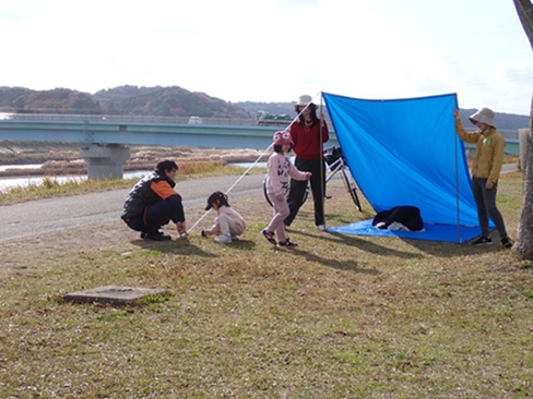 この日は風が強く、たき火を作ることはできませんでしたが、強風に耐えるブルーシートテントづくりやカセットガスを使ったご飯炊きなど、強風でもできるさまざまな体験をしてもらいました。